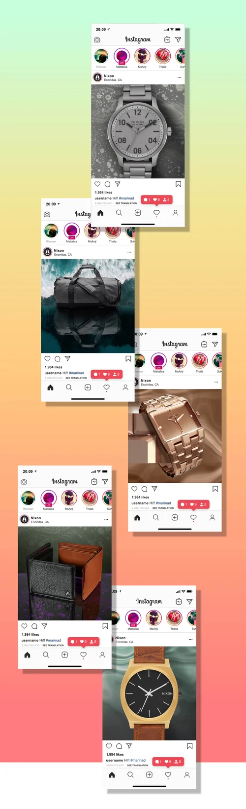 Series of social posts made for Nixon. Subtle video textures were used in the background to create the appearance of a static image with motion. Posts were strategically designed to stand out from competitors while reinforcing the brand’s visual identity and ethos.